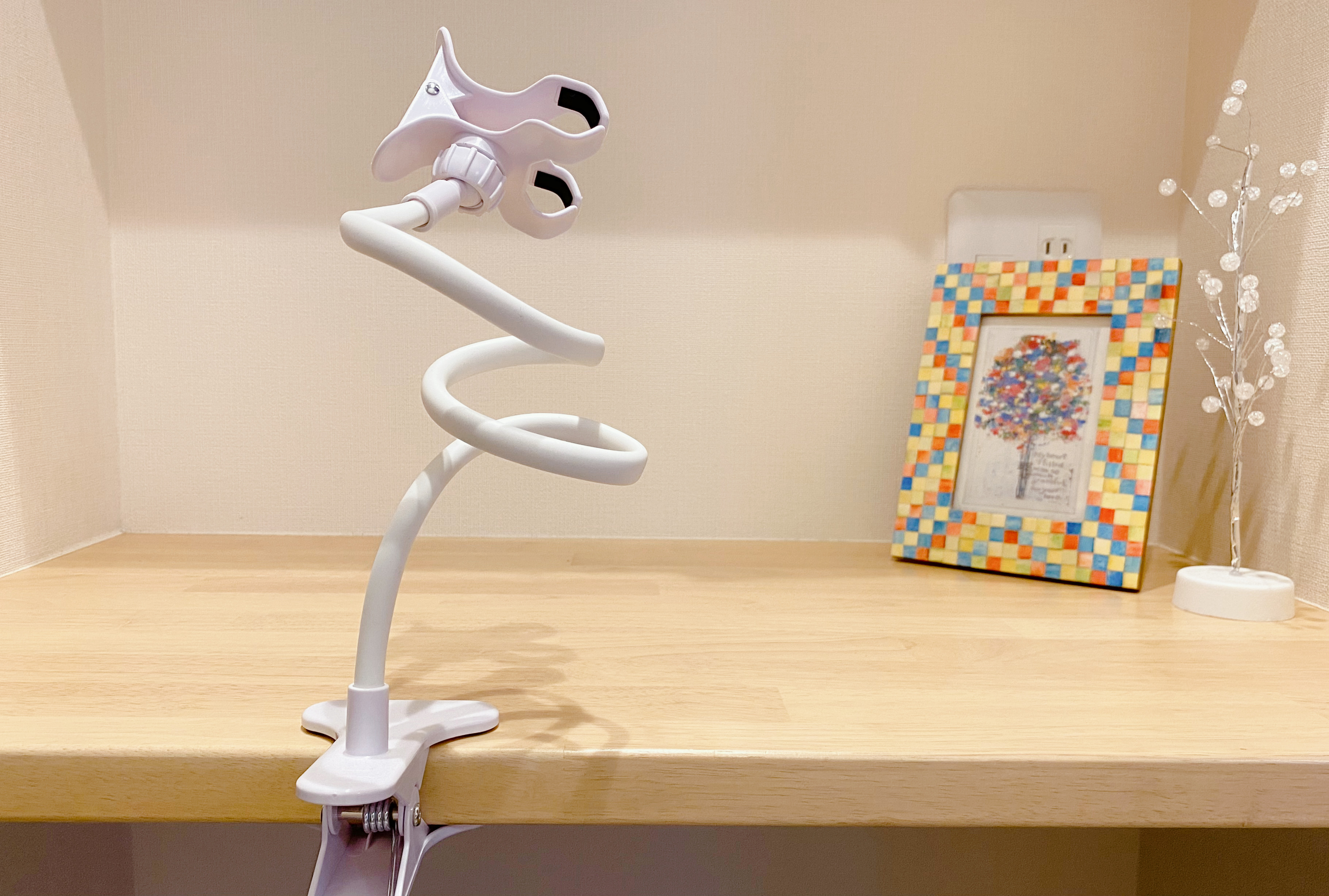 アームを曲げて高さや角度を自在に調節できる自由さもあるので、スマホでレシピを見ながら料理する時やベッドに取り付けて寝ながら動画を見たり…色々な場面で使えそうです!